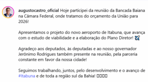 O prefeito Augusto Castro (PSD) reuniu-se com a Bancada Baiana na Câmara Federal, em Brasília na última terça-feira (11), para tratar do Orçamento da União de 2026. O principal objetivo da agenda foi apresentar os avanços do projeto do novo aeroporto do município.