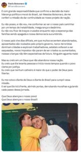 A confirmação, feita pelo próprio senador em redes sociais, posiciona Flávio Bolsonaro como herdeiro político do pai, o ex-presidente Jair Bolsonaro, que lhe teria conferido a “missão” de dar continuidade ao projeto bolsonarista. No pronunciamento, o pré-candidato adotou um tom crítico ao governo federal e repetiu temas recorrentes da retórica familiar.