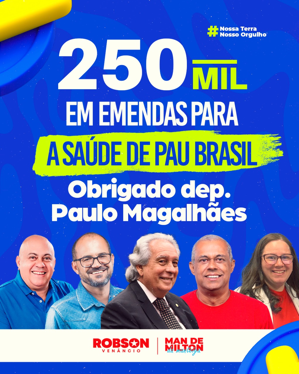 Nesse processo de desenvolvimento, a articulação política tem sido um diferencial. E uma das parcerias mais produtivas e relevantes para Pau Brasil é com o deputado federal Paulo Magalhães (PSD), reconhecido como um verdadeiro campeão de emendas parlamentares destinadas ao município. Sua atuação tem sido fundamental para viabilizar melhorias concretas nas áreas da saúde, assistência social, infraestrutura e agricultura familiar.