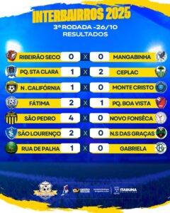 A terceira rodada do 24º Campeonato Interbairros de Futebol de Itabuna foi um sucesso de público, mesmo com os campos pesados devido às fortes chuvas deste domingo (26). Promovido pela Prefeitura, por meio da Secretaria de Esporte e Lazer, o evento contou com a presença em massa das torcidas.