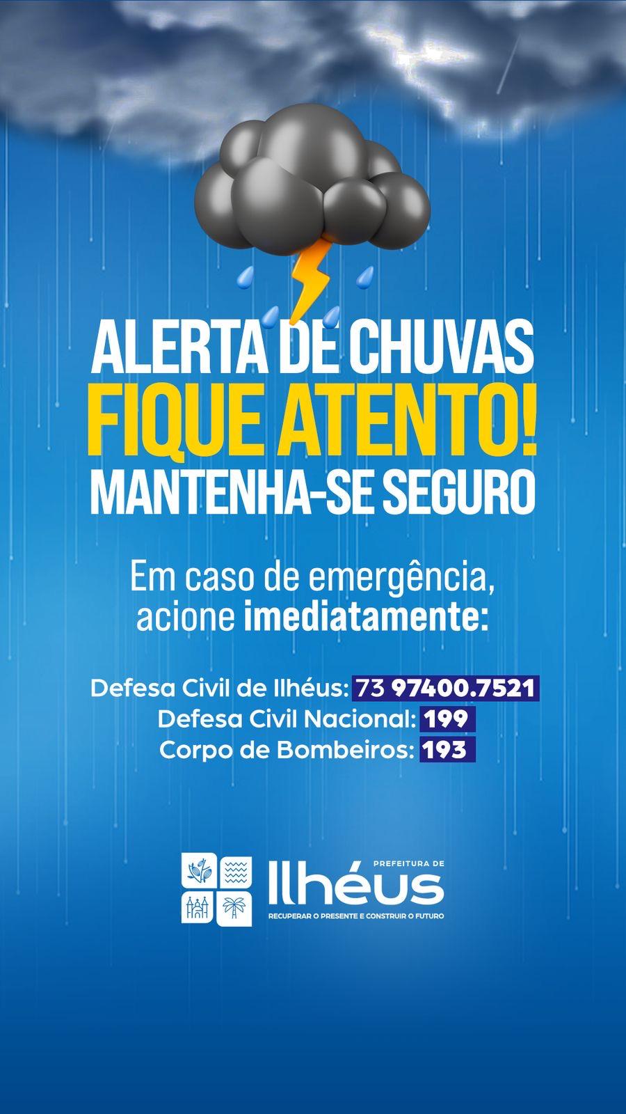 A Prefeitura de Ilhéus, por meio da Secretaria de Infraestrutura e Defesa Civil, reforça o alerta à população diante do aumento do volume de chuvas no município. A gestão orienta que os moradores fiquem atentos a sinais de deslizamentos, rachaduras em imóveis e demais situações de risco, principalmente em áreas mais vulneráveis.