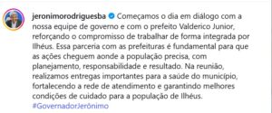 O governador Jerônimo Rodrigues destacou, em suas redes sociais, a importância do diálogo e da parceria com as prefeituras para a efetividade das ações do estado. Na ocasião, foram realizadas entregas simbólicas de equipamentos para a área da saúde de Ilhéus, com o objetivo de reforçar a rede municipal de atendimento.